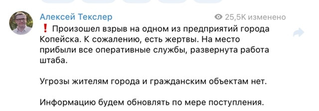 ‼😱Погибли люди при взрыве на одном из предприятий города Копейска. Об этом написал Алексей Текслер в соцсетях: